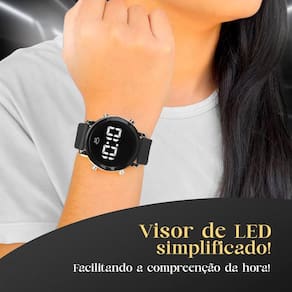 Relógio Digital Feminino Orizom Maria: Apresentando um design elegante e moderno, este relógio possui um maquinário em aço inoxidável com pintura eletrostática preta, garantindo durabilidade e estilo. Sua pulseira em silicone ajustável se adapta perfeitamente a qualquer pulso. A tampa blindada pode ser personalizada com uma arte especial, incluindo o nome de quem você ama, tornando-o ainda mais único e significativo.