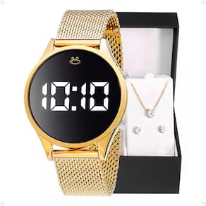 Kit Feminino Orizom Maria - Relógio Digital e Conjunto de Joias- Relógio Feminino Digital Orizom Maria - Modelo: Maria - Formato: Redondo - Diâmetro da Caixa: Aprox. 3,5 cm - Cor: Dourado Banhado - Mostrador: Preto com números brancos (ou vermelhos) - Material: Maquinário em aço inoxidável - Tampa: Blindada com arte exclusiva e logo da Orizom - Pulseira: Silicone, ajustável, para qualquer tamanho de pulso- Colar Banhado - Comprimento: Aprox. 45 cm - Detalhe: Pingente com pedra de strass transparente- Par de Brincos - Formato igual ao do pingente- Caixa Premium Orizom Maria - Modelo: Maria - Arte: Exclusiva - Função: Acomodar com elegância e segurançaO Kit Feminino Orizom Maria - Relógio Digital e Conjunto de Joias é perfeito para presentear a Maria da sua vida. Com sofisticação e funcionalidade, este conjunto é ideal para ocasiões especiais, valorizando cada detalhe. Adquira já o seu!
