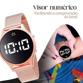 Relogio Feminino Digital Led Aço + Colar Moda Ajustavel Led Kit Feminino Orizom Maria - Relógio Digital + Conjunto de Joias - Relógio Feminino Digital Orizom Maria - Modelo: Maria - Formato: Redondo - Diâmetro da Caixa: Aprox. 3,5 cm - Cor: Rosê - Mostrador: Preto com números brancos (opção com números vermelhos disponível) - Material: Maquinário em aço inoxidável - Pulseira: Silicone, ajustável
