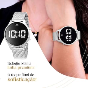 O Relógio Feminino Digital Orizom Maria possui um formato redondo, diâmetro da caixa de aproximadamente 3,5 cm e é todo feito em aço inoxidável. O mostrador preto com números brancos (opção com números vermelhos disponível) e a pulseira de silicone ajustável adicionam um toque de sofisticação e praticidade.