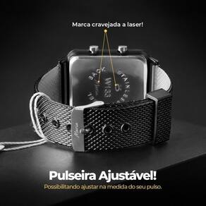 Fabricado em aço inoxidável e banhado em ouro 18k, este relógio oferece durabilidade e um acabamento impecável, garantindo que você tenha uma peça de alta qualidade por muitos anos. A pulseira em silicone ajustável proporciona conforto para qualquer tamanho de pulso, tornando-o perfeito para uso diário.
