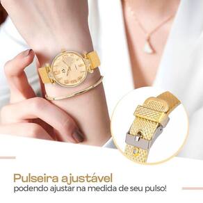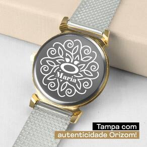 Relógio feminino orizom - modelo maria - tipo: analógico - material: aço inoxidável com pintura eletrostática - cor do maquinário: dourado banhado - cor do mostrador: dourado banhado - tampa: blindada, com arte exclusiva da orizom, contendo todos os detalhes de autenticidade