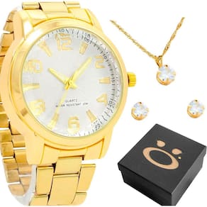 Relogio Feminino Dourado Aço + Brincos Strass Colar + Caixa Social Inoxidável Presente Kit Feminino Luxo - Relógio Banhado a Ouro, Colar, Pingente, Brincos e Caixa Premium Este kit feminino é a combinação perfeita de elegância, sofisticação e qualidade. O presente ideal para datas especiais como Dia dos Namorados, Dia das Mães, aniversários ou qualquer momento especial. O kit inclui: - Relógio Feminino Banhado a Ouro - Sofisticado e elegante, todo em aço inoxidável com acabamento dourado. Resistente à água, garantindo durabilidade e requinte no uso diário. Disponível com fundo do mostrador branco ou dourado. Importante: - Evite contato com água quente e uso excessivo de perfumes e produtos químicos. - O design dos detalhes internos do mostrador pode variar conforme disponibilidade no . - Colar Banhado - Delicado e sofisticado, com aproximadamente 45 cm de comprimento, realçando a beleza e charme do look. - Pingente em Formato de Pedrinha de Strass Transparente - Elegante e atemporal, feito para destacar ainda mais a beleza do colar. - Par de Brincos - No mesmo design e material do pingente, garantindo harmonia e elegância para diversas ocasiões. - Caixa Ultra Premium Orizom - Modelo Maria - Embalagem luxuosa, recortada a laser com alta precisão, acabamento em glitter dourado e detalhe em pedrinha de strass, proporcionando sofisticação e exclusividade ao kit. Seja a pessoa que surpreende com requinte e qualidade. Presenteie com o conjunto incrível desse kit feminino de luxo. Marca: Não Informado