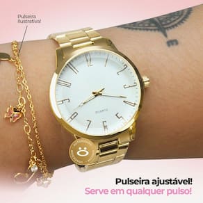 Relogio feminino dourado aço prova dagua + colar ponto luz casual social presente descrição do produto: