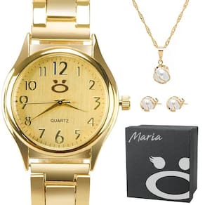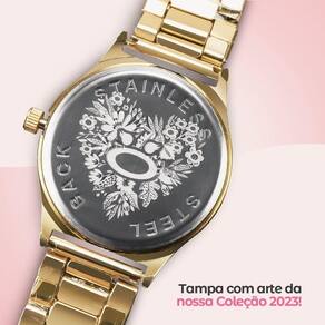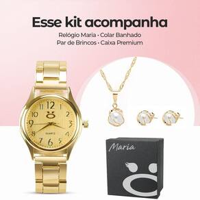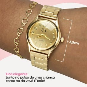 - 1 Relógio Analógico em Aço Inoxidável Banhado, cor dourado, com tampa personalizada com arte de coração para um toque único e charmoso. - 1 Colar em Aço Inoxidável Banhado com Pingente de Strass, que adiciona um brilho sutil e elegante ao seu look. - 1 Par de Brincos em Aço Inoxidável Banhado com Pedrinha de Strass, para um toque de brilho delicado e sofisticado.