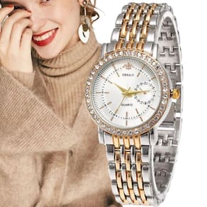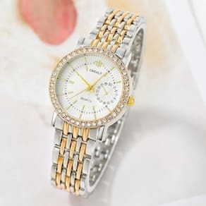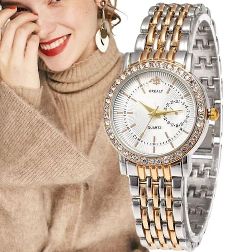 Relógio feminino dourado e prata strass aço luxo elegante Relógio feminino prata e dourado com fundo branco