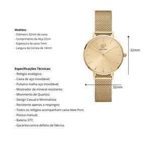 Visor: Analógico Marca: New Port Movimento: Quartzo Japonês Caixa: Aço Inoxidável Prateado Pulseira: Malha Aço Inoxidável Dourado Fecho: Gancho Face: Dourado Perolado Minimalista Mostrador: Mineral Resistente Ponteiros: 02 Resistente: A Respingos Bateria: 377 Com Maior Durabilidade Design: Minimalista Elegante Peso: 104g Categoria: Relógio Feminino Acompanha: Caixa da marca New Port e Manual Garantia: 12 meses contra defeito de fabricação