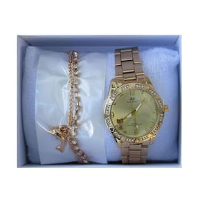 Especificações Técnicas: Material da Pulseira: Aço Inoxidável de cor Dourada Material da Caixa: Liga de Metal, Mecanismo: Quartzo Resistente a agua, Não é A PROVA D'AGUA.