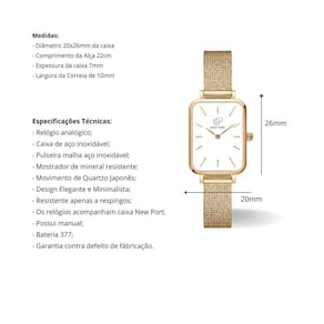 O Relógio Feminino New Port Quadrado Vermont Gold, com sua pulseira de aço inoxidável dourado, exibe dimensões de 20x26mm. A caixa é confeccionada em metal dourado, harmonizando com o mostrador branco protegido por um vidro de mineral resistente.