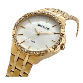 Relógio Feminino Dourado Seculus Com Semijoias77114LPSKDS1 relógio analógico com folheação dourada, com caixa de metal com cristais aplicados, e mostrador em madrepérola. Sua pulseira é aço super resistente com fecho de acionamento lateral de fácil ajuste, ideal para todos os pulsos, inclusive para os médios e finos. Para acompanhar o relógio, um colar de pedras e um par de brincos combinando com o design da peça. Esse relógio possui a caixa com 3,8 cm de tamanho.