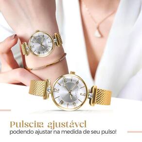 Relógio Feminino Analógico Orizom Maria Dourado Banhado à Prova D'água Pulseira em Silicone AjustávelChegou o momento de adicionar um toque de elegância e sofisticação ao seu visual com o relógio feminino Orizom Maria. Com seu design elegante e funcionalidade impecável, este relógio é a escolha perfeita para qualquer ocasião.Características:- Material: Aço inoxidável banhado a ouro dourado, garantindo durabilidade e um brilho luxuoso.- Tipo de Display: Analógico, proporcionando uma leitura clara e precisa do tempo.- Resistência à Água: Prova d'água, ideal para uso diário e ocasional, mantendo o relógio protegido em qualquer situação.- Pulseira: Pulseira em silicone ajustável, proporcionando conforto e praticidade para se adaptar a qualquer pulso.- Estilo: Elegante e versátil, adequado para diversas ocasiões, do dia a dia a eventos especiais.Conteúdo da Embalagem:- 1 Relógio Feminino Analógico Orizom Maria Dourado Banhado à Prova D'água Pulseira em Silicone Ajustável.- 1 Caixa Premium Orizom Maria, ideal para presentear ou armazenar o relógio com segurança e estilo.Adicione um toque de luxo ao seu visual ou presenteie alguém especial com este relógio feminino Orizom Maria. Combinando elegância e funcionalidade, este relógio é um item indispensável em qualquer coleção de acessórios femininos. Aproveite essa oportunidade e adquira o seu agora!