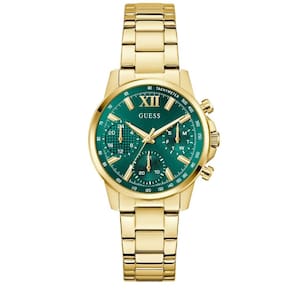 Relógio Feminino Guess Bailey GW0933L6 Dourado O relógio apresenta um mostrador dourado multifuncional com submostradores para dia da semana, data e hora em formato de 24 horas. O estojo de 36 mm é feito de aço inoxidável polido, complementado por uma pulseira de elos metálicos dourados e um fecho dobrável. Possui resistência à água de até 30 metros 3 ATM , adequada para uso diário e proteção contra respingos. Além disso, o modelo é descrito como parte da coleção Bailey da Guess, que combina elementos de estilo clássico com toques modernos, oferecendo peças versáteis e sofisticadas. Especificações Técnicas Mecanismo: Analógico Quartzo Gênero: Feminino Visor: Verde Vidro: Cristal mineral Resistente à água: 30m Características: Submostradores para dia da semana, data e hora Diâmetro da caixa: 28mm Tipo de fecho: Fivela Simples : 1 ano pela fabricante Guess Marca: Não Informado Ean: 7909669215172