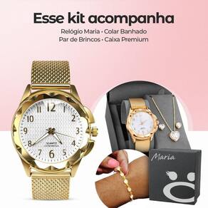 O Relógio Feminino Maria Dourado Prova D'Agua Colar Pulseira é um conjunto elegante de acessórios que adicionará um toque de charme ao seu visual. Este kit é perfeito para presentear alguém especial ou se presentear.