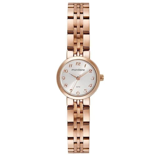 Delicado, esse relógio é um clássico com caixa pequena e numeração completa. Possui mostrador prata, folheação rosé, caixa em metal e pulseira fina em aço. Esse relógio possui a caixa em 2,3 cm de tamanho.