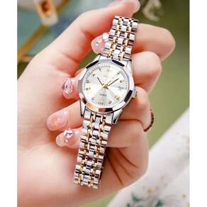 Relógio feminino OLEVS em ouro e prata com face branca e diamante