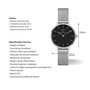 O Relógio Feminino Pulseira Diana Silver da New Port ostenta uma pulseira de aço inoxidável prata, complementada por um diâmetro de 32mm. A caixa é confeccionada em metal prateado, abraçando um mostrador preto protegido por vidro de mineral endurecido de alta resistência.