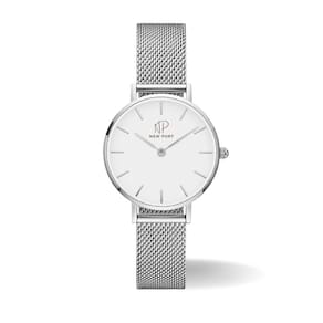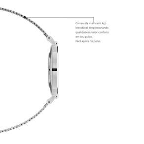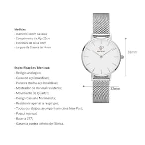 O Relógio Feminino Pulseira Monalisa Silver da New Port ostenta uma pulseira de aço inoxidável prata, complementada por um diâmetro de 32mm. A caixa é confeccionada em metal prateado, abraçando um mostrador branco protegido por vidro de mineral endurecido de alta resistência.