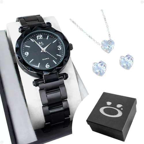 Relógio Feminino Orizom Maria Kit com Acessórios - Luxo e SofisticaçãoO presente perfeito para momentos especiais ou para você se presentear com muito estilo e elegância.Conteúdo do Kit:- Relógio Feminino Orizom Maria: Com maquinário analógico, pulseira e mostrador na cor preto black piano, proporcionando um visual elegante e sofisticado. A tampa traseira é blindada e possui uma arte exclusiva da Orizom, reforçando sua autenticidade e atenção aos detalhes.- Colar em Aço Inoxidável Prata: Resistente e versátil, ideal para diversas ocasiões e perfeito para complementar o estilo do conjunto.- Pingente de Strass Transparente: Adiciona um toque de brilho e sofisticação ao colar.- Par de Brincos: Com design idêntico ao pingente do colar, formando um conjunto harmonioso e moderno.- Caixa Ultra Premium: Embalagem de luxo, ideal para presentear e encantar.Especificações do Relógio:- Marca: Orizom- Modelo: Maria- Tipo: Analógico- Cor: Preto black piano- Material: Aço inoxidável- Autenticidade: Tampa traseira com arte exclusiva OrizomEste kit é a escolha ideal para quem valoriza o luxo, a durabilidade e o design moderno. Adquira já o seu!