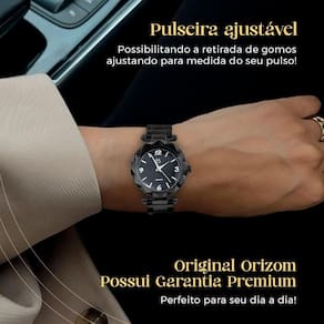 - Relógio Feminino Orizom Maria: Com maquinário analógico, pulseira e mostrador na cor preto black piano, proporcionando um visual elegante e sofisticado. A tampa traseira é blindada e possui uma arte exclusiva da Orizom, reforçando sua autenticidade e atenção aos detalhes.