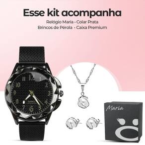 Além disso, o Par de Brincos de Pérola adiciona um toque clássico e refinado ao seu visual, complementando perfeitamente o estilo moderno do relógio. E o Colar em Aço Inoxidável acrescenta um brilho sutil, ideal para ocasiões especiais ou uso diário.