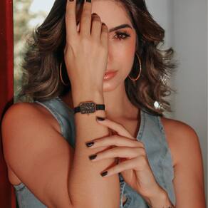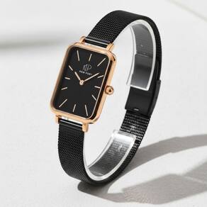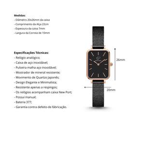 O Relógio Feminino New Port Quadrado Vermont All Black, com sua pulseira de aço inoxidável preta, apresenta dimensões de 20x26mm. A caixa é elaborada em metal rosé, contrastando com o mostrador preto, que é protegido por um vidro de mineral resistente.