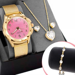 Adquira já o Kit Elegante de Acessórios Relógio e adicione um toque de glamour e sofisticação ao seu visual! O conjunto inclui um Relógio Analógico à Prova D'água, com uma deslumbrante cor dourada e fundo rosa, pulseira em silicone ajustável para garantir conforto. Além disso, vem com um Colar Banhado com Pingente de Strass em forma de coração, um par de Brincos Banhados com design de coração, e uma Pulseira Banhada com pedrinhas para completar seu visual com um brilho sutil. Este kit inclui também uma caixa premium Orizom Maria para uma apresentação requintada. Aproveite para presentear alguém especial ou adicionar um toque de luxo ao seu estilo diário. Garanta já o seu!