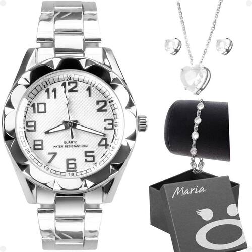 Relogio Feminino Prova Dagua Prata + Colar + Pulseira Zirconia Moda Coração Presente Adquira agora o Kit Elegante de Acessórios em Aço Inoxidável e adicione um toque de sofisticação e durabilidade ao seu visual Este conjunto é perfeito para presentear a si mesmo ou alguém especial.