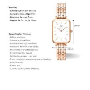 Medidas Relógio: - Diâmetro 20x26mm da caixa - Comprimento da Alça 22cm - Espessura da caixa 7mm - Largura da Correia de 10mm ***Não acompanha ferramenta para ajuste de pulseira*** Especificações Técnicas: - Aço Inoxidável; - Pulseira de metal com elos; - Mostrador de mineral resistente; - Movimento de Quartzo Japonês; - Design Minimalista e Casual; - Resistente apenas a respingos de água; - Todos os relógios acompanham caixa da New Port; - Possui manual New Port; - Bateria 377 para melhor durabilidade; - Relógio analógico; - Garantia contra defeito de fábricação.