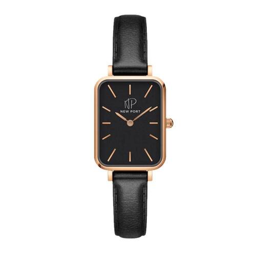 O Relógio Feminino New Port Quadrado Square Piermont Black Rosé, com sua pulseira de couro vegano preto, possui um elegante diâmetro de 20x26mm. Sua caixa em metal rosé abriga um mostrador preto, protegido por vidro de mineral resistente, garantindo durabilidade e estilo.