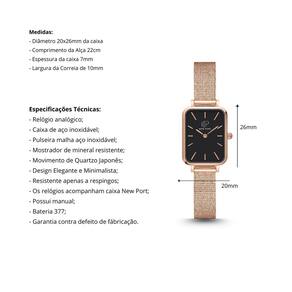 O Relógio Feminino New Port Quadrado Vermont, com sua pulseira de aço inoxidável rosé, apresenta dimensões de 20x26mm. A caixa é fabricada em metal rosé, contrastando elegantemente com o mostrador preto, protegida por um vidro de mineral resistente.