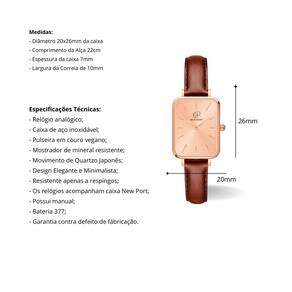 O Relógio Feminino New Port Quadrado Piermont Fundo Rosé, com sua pulseira de couro vegano marrom, possui um elegante diâmetro de 20x26mm. Sua caixa em metal rosê abriga um mostrador preto, protegido por vidro de mineral resistente, garantindo durabilidade e estilo. Adapte-se com elegância a todas as ocasiões com este relógio. Um acessório essencial que complementa perfeitamente seu estilo, seja nos ambientes corporativos ou nos eventos sociais mais sofisticados. Este relógio se destaca como uma escolha refinada e versátil. A pulseira é de fácil ajuste e se adapta bem a todos os pulsos. Medidas: - Diâmetro 20x26mm da caixa - Comprimento da Alça 22cm - Espessura da caixa 7mm - Largura da Correia de 10mm
