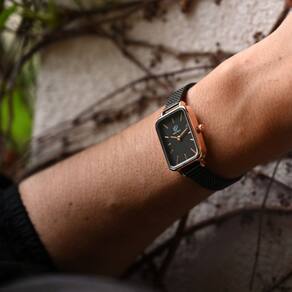 O Relógio Feminino New Port Quadrado Vermont Full Black, com sua pulseira de aço inoxidável preta, apresenta dimensões de 20x26mm. A caixa é elaborada em metal rosé, contrastando com o mostrador preto, que é protegido por um vidro de mineral resistente.