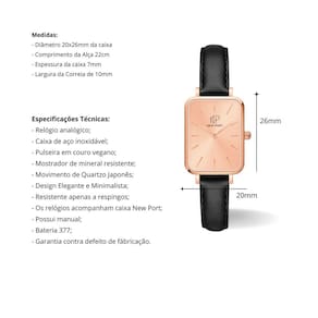 Medidas Relógio: - Diâmetro 20x26mm da caixa - Comprimento da Alça 22cm - Espessura da caixa 7mm - Largura da Correia de 10mm