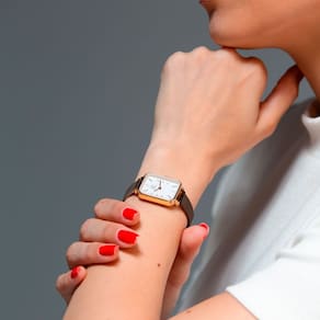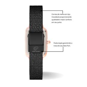 O Relógio Feminino New Port Quadrado Vermont Black Fundo Branco, com sua pulseira de aço inoxidável preta, apresenta dimensões de 20x26mm. A caixa é elaborada em metal rosé, contrastando com o mostrador Branco, que é protegido por um vidro de mineral resistente.