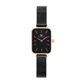 Relógio Feminino Saint Germain Quadrado Square Houston Rosé Gold com pulseira de aço inoxidável preta. A caixa é metal rosé gold e o mostrador preto, vidro com mineral endurecido com alta resistência.