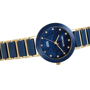 Cor do mostrador: Azul madrepérola com marcadores em cristal