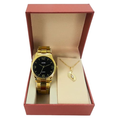 Relógio Feminino Skmei Analógico SK003 DouradoMarca: Skmei Categoria: Analógico Analógico: Sim (1 Horário) Ponteiros Fluorescentes: Não Digital: Não Calendário: Não Despertador: Não Mostra o Dia da Semana: Não Mostra o Dia do Mês: Não Cronômetro: Não Contador Regressivo: Não Luz: NãoResistente à Água: 3 ATM (Resiste a imersões breves) - Respingos: Sim - Chuva: Sim - Lavar Carro: Sim - Lavar Louça: Sim - Natação: Não - Mergulho: Não Característica do Vidro: Cristal Mineral Tipo de Fecho: Dobrável com Botão Cor da Caixa: Dourado Material da Caixa: Metal Banho IP Formato da Caixa: Redondo Diâmetro da Caixa: 39,00 (mm) Espessura da Caixa: 9,00 (mm) Cor da Pulseira: Dourado Material da Pulseira: Metal Largura da Pulseira: 18,00 (mm) Comprimento Máximo da Pulseira: 230,00 (mm) Alimentação: Bateria Interna Peso Líquido: 0,090 Kg Modelo: SK003 Cor Predominante: Dourado Garantia: 12 MesesConteúdo da Embalagem: 01 Relógio 01 Embalagem 01 Termo de Garantia