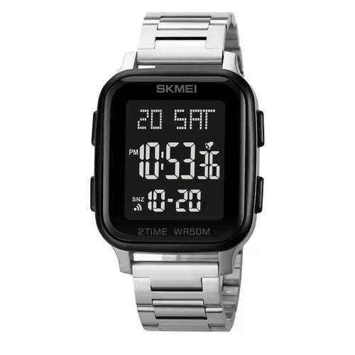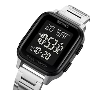 Marca: Skmei Categoria: Digital Analógico: Não Digital: Sim (2 Horário) Calendário: Sim Despertador: Sim Mostra o Dia da Semana: Sim Mostra o Dia do Mês: Sim Cronômetro: Sim Contador Regressivo: Sim Luz: Sim Cor da Iluminação: Verde Resistente à Água: 5 ATM - Respingos: Sim - Chuva: Sim - Lavar Carro: Sim - Lavar Louça: Sim - Natação: Sim - Mergulho: Não Característica do Vidro: Cristal Mineral Tipo de Fecho: Dobrável com Botão Cor da Caixa: Prata Material da Caixa: Plástico Formato da Caixa: Quadrado Comprimento da Caixa: 42,00 (mm) Largura da Caixa: 37,00 (mm) Espessura da Caixa: 12,00 (mm) Cor da Pulseira: Prata Material da Pulseira: Aço Largura da Pulseira: 20,00 (mm) Comprimento Máximo da Pulseira: 260,00 (mm) Alimentação: Bateria Interna Peso Líquido: 0,080 Kg Modelo: 1859 Cor Predominante: Prata Cor Diferencial: Preto Garantia: 12 Meses