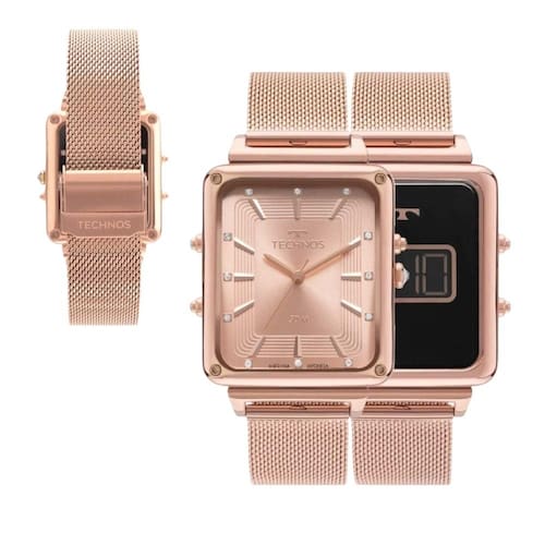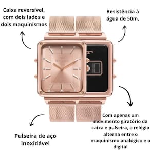 a oficial mix é uma uma empresa especializada em vendas de produtos multimarcas, que desde 2015 encanta os seus cliente, oferecendo produtos de excelente qualidade, , com garantia de fábrica e com preços imbatíveis. Gênero: feminino cor: rose mecanismo: analógico/digital tamanho da caixa: médio material da caixa: aço material da pulseira: aço inoxidável material do vidro: cristal mineral comprimento do relógio: 24cm espessura da caixa: 1,0cm dimensões da caixa: 5,0cm de diâmetro nível de resistência à água:50m pulseira ajustável: sim calendário: não possui cronômetro: não possui função chime: não possui função de aviso de hora cheia garantia do fabricante: garantia do relógio de 1 ano. Produto. medidas aproximadas