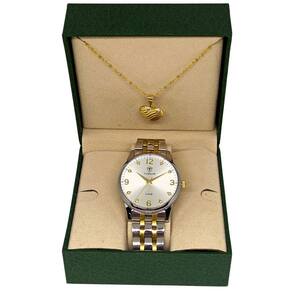 Relógio Feminino Tuguir Analógico 2130 Prata e DouradoMarca: Tuguir Categoria: Analógico Analógico: Sim (1 Horário) Ponteiros Fluorescentes: Selecione Digital: Não Luz: SelecioneResistente à Água: 5 ATM (Pode ser utilizado para nadar no raso, por pouco tempo submerso) - Respingos: Sim - Chuva: Sim - Lavar Carro: Sim - Lavar Louça: Sim - Natação: Sim - Mergulho: Não Característica do Vidro: Cristal Mineral Tipo de Fecho: Dobrável com Botão Cor da Caixa: Prata Material da Caixa: Metal Banho IP Formato da Caixa: Redondo Diâmetro da Caixa: 39,00 (mm) Espessura da Caixa: 11,00 (mm) Cor da Pulseira: Prata Material da Pulseira: Aço Largura da Pulseira: 17,50 (mm) Comprimento Máximo da Pulseira: 270,00 (mm) Alimentação: Bateria Interna Peso Líquido: 0,080 Kg Modelo: 2130 Cor Predominante: Prata Cor Diferencial: Dourado Garantia: 12 MesesConteúdo da Embalagem: 01 Relógio 01 Embalagem 01 Termo de Garantia