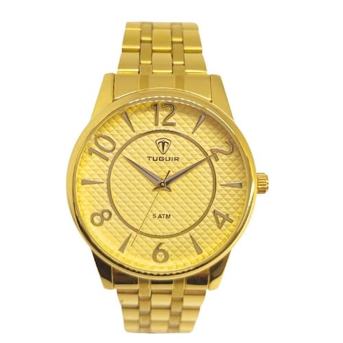 Relógio Feminino Tuguir ógico 2135 Dourado Relógio Feminino Tuguir ógico 2135 Dourado Marca: Tuguir Categoria: ógico ógico: Sim 1 Horário Ponteiros Fluorescentes: Selecione Digital: Não Luz: Selecione Resistente à Água: 5 ATM Pode ser para nadar no raso, por pouco tempo submerso - Respingos: Sim - Chuva: Sim - Lavar Carro: Sim - Lavar Louça: Sim - Natação: Sim - Mergulho: Não Característica do Vidro: Cristal Mineral Tipo de Fecho: Dobrável com Botão Cor da Caixa: Dourado Material da Caixa: Metal Banho IP Formato da Caixa: Redondo Diâmetro da Caixa: 39,00 mm Espessura da Caixa: 11,00 mm Cor da Pulseira: Dourado Material da Pulseira: Aço Largura da Pulseira: 17,50 mm Comprimento Máximo da Pulseira: 260,00 mm Alimentação: Bateria Interna Peso Líquido: 0,080 Kg Modelo: 2135 Cor Predominante: Dourado : 12 Meses Conteúdo da Embalagem: 01 Relógio 01 Embalagem 01 Termo de Marca: Não Informado Ean: 7891368317823