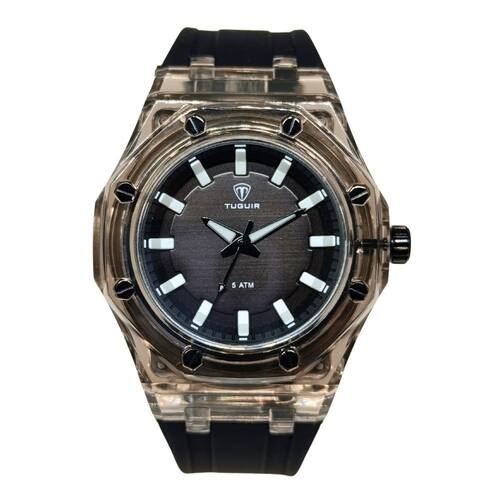 Marca: Tuguir Categoria: Analógico Analógico: Sim (1 Horário) Ponteiros Fluorescentes: Não Digital: Não Luz: Selecione Resistente à Água: 5 ATM - Respingos: Sim - Chuva: Sim - Lavar Carro: Sim - Lavar Louça: Sim - Natação: Sim - Mergulho: Não Característica do Vidro: Acrílico Tipo de Fecho: Fivela Cor da Caixa: Preto Material da Caixa: Plástico Formato da Caixa: Redondo Diâmetro da Caixa: 40,00 (mm) Espessura da Caixa: 14,00 (mm) Cor da Pulseira: Preto Material da Pulseira: Borracha Largura da Pulseira: 19,50 (mm) Comprimento Máximo da Pulseira: 250,00 (mm) Alimentação: Bateria Interna Peso Líquido: 0,060 Kg Modelo: TG9148 Cor Predominante: Preto Garantia: 12 Meses
