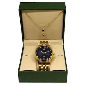 Marca: Tuguir Categoria: Analógico Analógico: Sim (1 Horário) Ponteiros Fluorescentes: Não Digital: Não Calendário: Não Despertador: Não Mostra o Dia da Semana: Não Mostra o Dia do Mês: Não Cronômetro: Não Contador Regressivo: Não Luz: Não Resistente à Água: 5 ATM - Respingos: Sim - Chuva: Sim - Lavar Carro: Sim - Lavar Louça: Sim - Natação: Sim - Mergulho: Não Característica do Vidro: Cristal Mineral Tipo de Fecho: Dobrável Cor da Caixa: Dourado Material da Caixa: Metal Banho IP Formato da Caixa: Redondo Diâmetro da Caixa: 39,00 (mm) Espessura da Caixa: 11,50 (mm) Cor da Pulseira: Dourado Material da Pulseira: Aço Largura da Pulseira: 18,00 (mm) Comprimento Máximo da Pulseira: 220,00 (mm) Alimentação: Bateria Interna Peso Líquido: 0,080 Kg Modelo: W2122 Cor Predominante: Dourado Cor Diferencial: Azul Garantia: 12 Meses
