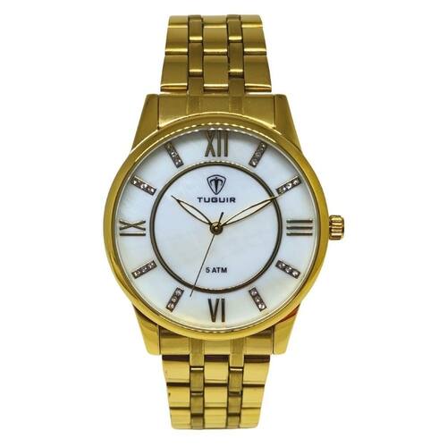 Relógio Feminino Tuguir Analógico W2124C Dourado e Branco Relógio Feminino Tuguir Analógico W2124C Dourado e Branco Marca: Tuguir Categoria: Analógico Analógico: Sim 1 Horário Ponteiros Fluorescentes: Selecione Digital: Não Luz: Selecione Resistente à Água: 5 ATM Pode ser Utilizado para nadar no raso, por pouco tempo submerso - Respingos: Sim - Chuva: Sim - Lavar Carro: Sim - Lavar Louça: Sim - Natação: Sim - Mergulho: Não Característica do Vidro: Cristal Mineral Tipo de Fecho: Dobrável com Botão Cor da Caixa: Dourado Material da Caixa: Metal Banho IP Formato da Caixa: Redondo Diâmetro da Caixa: 39,00 mm Espessura da Caixa: 11,00 mm Cor da Pulseira: Dourado Material da Pulseira: Aço Largura da Pulseira: 17,50 mm Comprimento Máximo da Pulseira: 270,00 mm Alimentação: Bateria Interna Peso Líquido: 0,080 Kg Modelo: W2124C Cor Predominante: Dourado Cor Diferencial: Branco : 12 Meses Conteúdo da Embalagem: 01 Relógio 01 Embalagem 01 Termo de