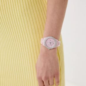 Com caixa de 37 mm e mostrador multifuncional, este modelo apresenta três subdials com funções de dia da semana, data e formato 24h, tudo com excelente legibilidade. Os ponteiros e marcadores em prata contrastam elegantemente com o fundo rosa, entregando um visual feminino, funcional e ousado.