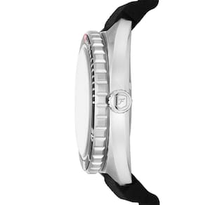 A caixa de aço inoxidável prata de 42 mm abriga um mostrador preto com textura ondulada que remete ao fundo do mar, realçado por marcadores circulares luminosos e ponteiros de alta visibilidade, incluindo um ponteiro de segundos em vermelho vibrante. O aro giratório unidirecional com escala de 60 minutos reforça o apelo esportivo e utilitário do relógio.