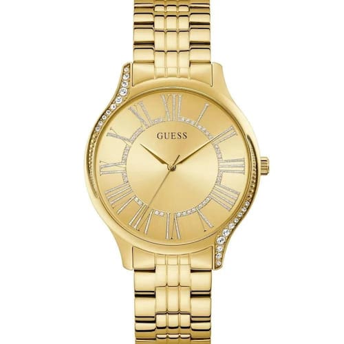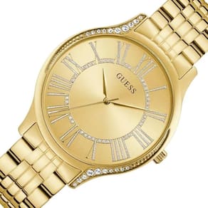 Esse modelo Guess Feminino, possui mecanismo analógico e fundo com Algarismos Romano. A pulseira é em aço inoxidável, na cor dourado. O visor é em cristal mineral, e o diferencial esta nos detalhes de pedras que esse lindo acessório possui. O Relógio Guess Feminino Analógico Dourado- GW0024L2, une um design ousado, moderno e inovador, irá valorizar e destacar todos os seus looks.