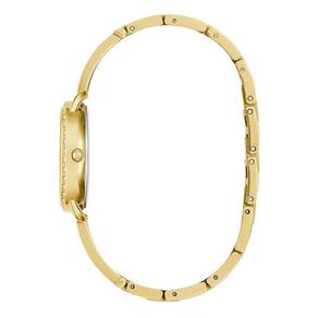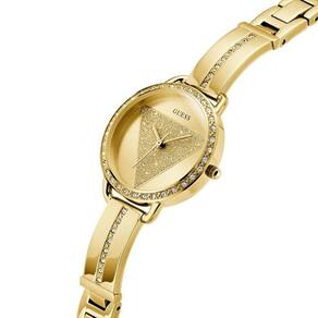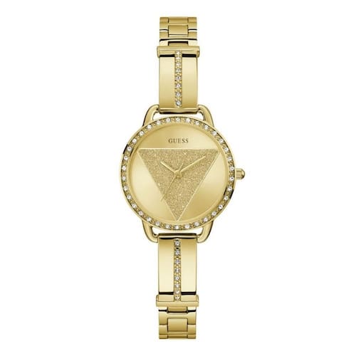 Com caixa de 30mm, o relógio traz equilíbrio perfeito entre delicadeza e impacto visual. O mostrador dourado recebe destaque especial com o icônico triângulo Guess em textura brilhante, símbolo que reforça a identidade única da marca.