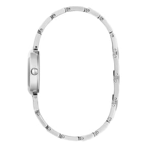 A pulseira em aço inoxidável prateado possui elos diferenciados que remetem ao estilo fashion da marca, proporcionando ajuste confortável e seguro, além de um toque de exclusividade.