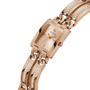 A pulseira em aço inoxidável rosé é o grande diferencial: composta por elos geométricos, ela se destaca pelos detalhes laterais cravejados de cristais, que adicionam brilho sutil e tornam o relógio uma verdadeira joia fashion.